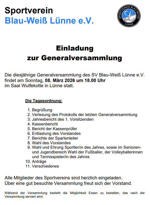 Die diesjährige Generalversammlung des SV Blau-Weiß Lünne e.V.