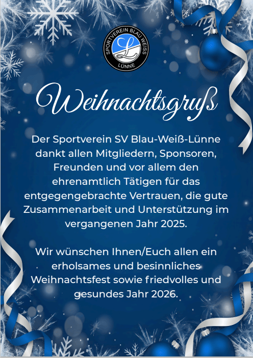 Wir wünschen all unseren Mitgliedern, Freunden und Gönnern des SV Blau-Weiß Lünne ein besinnliches Weihnachtsfest